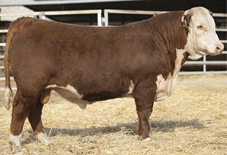 8051 is one of a kind, deep ribbed and big bellied with an exceptionally big top. We lost him this fall but we will continue to use him through ET. Raised by Flying S Herefords. |