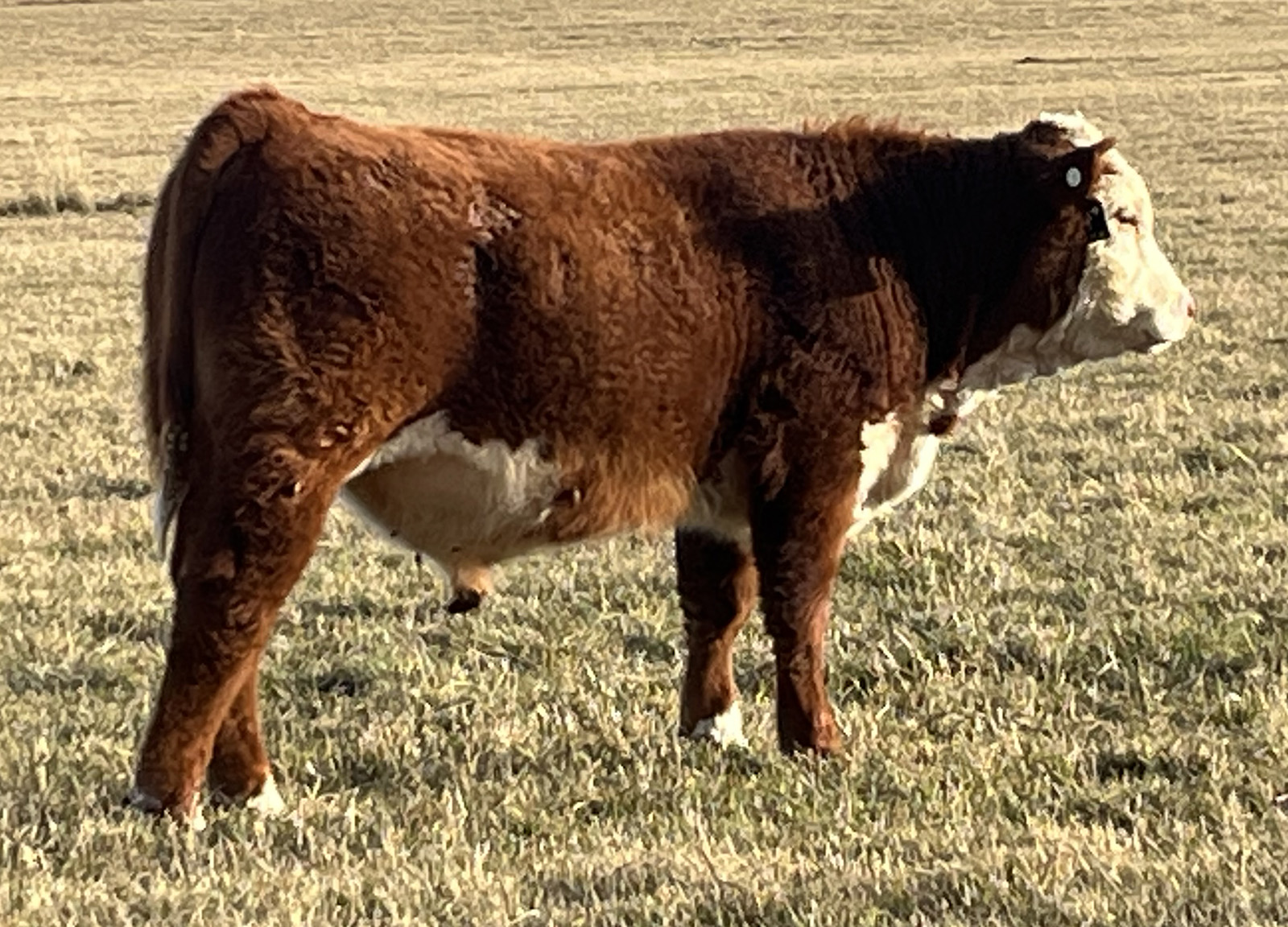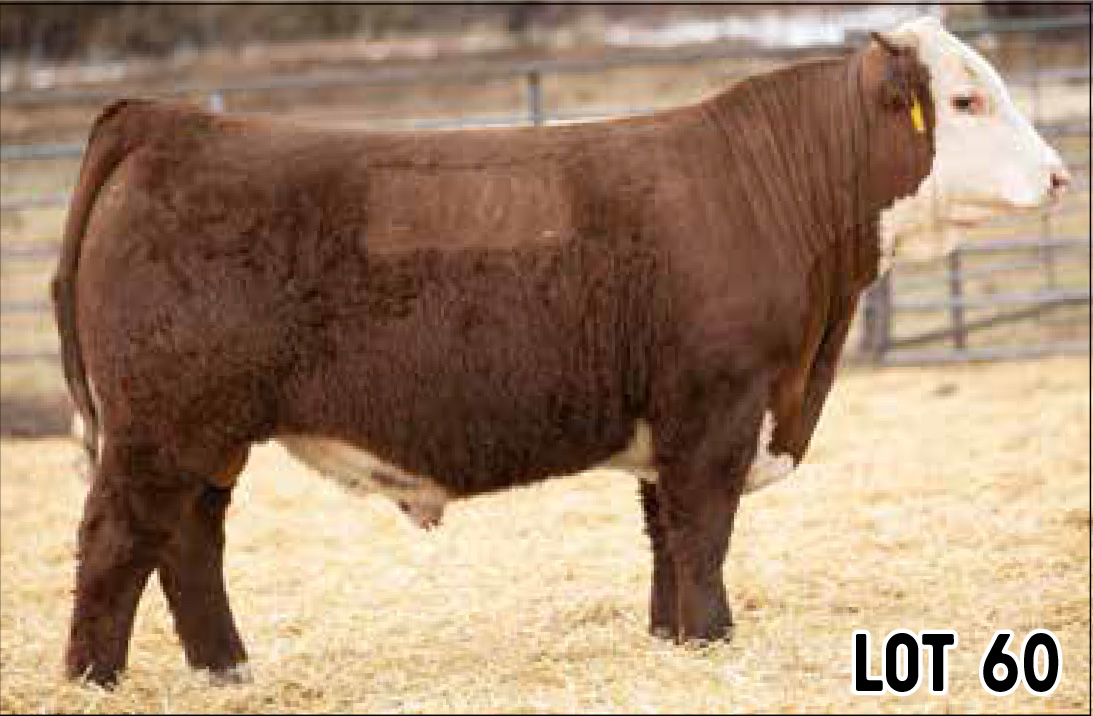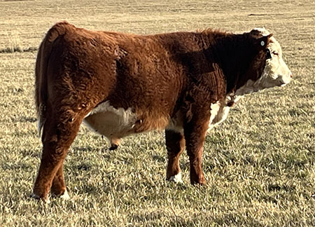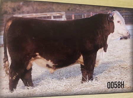8051 is one of a kind, deep ribbed and big bellied with an exceptionally big top. We lost him this fall but we will continue to use him through ET. Raised by Flying S Herefords. |